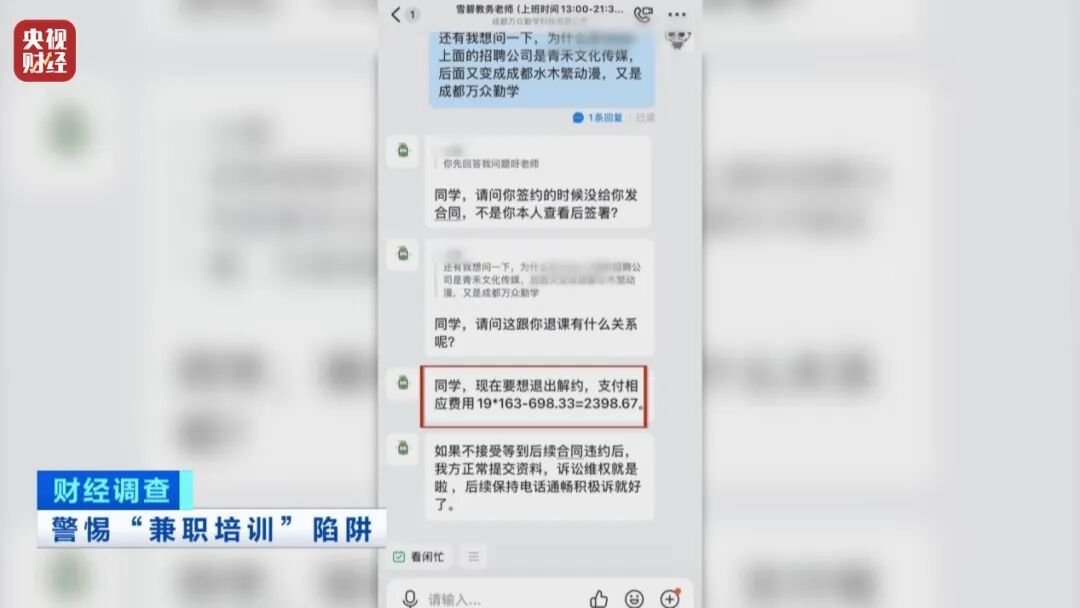 果果无法接受这样的兼职工作,提出退课请求,却被要求支付1400元违约金。记者发现,有相同遭遇的年轻人还有许多。从发布招聘信息、签订培训服务协议、提供培训以及办理课程费用分期服务的几乎都是不同的公司,求职者想维权困难重重。