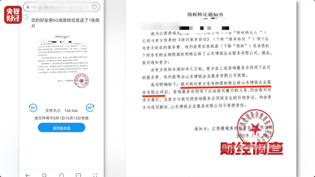 就在记者对学易付公司进行调查的同时,有在这场兼职转培训生意里上当的学员,给记者发来消息,目前,这家公司已经将逾期没有交的学费,作为“债权”转让给了山东博锐企业服务有限公司。